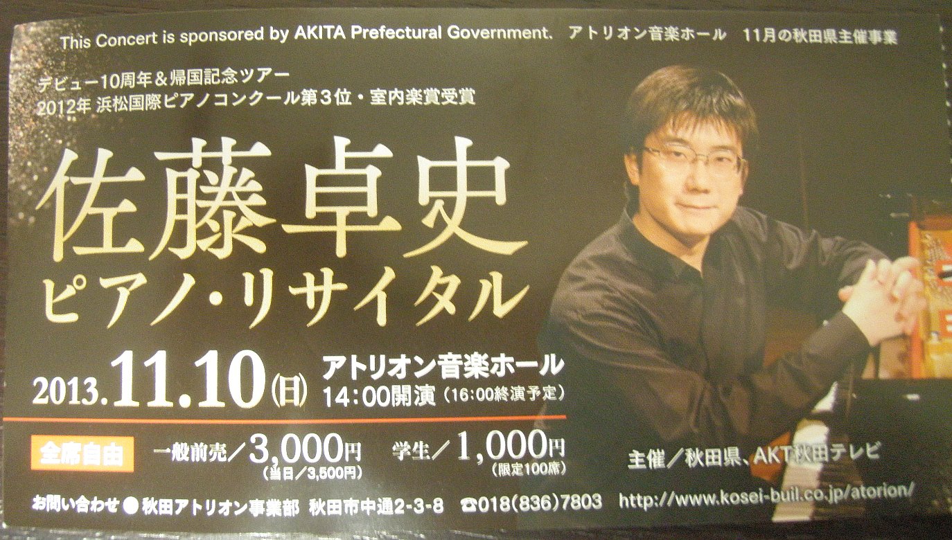 JUGEMテーマ:コンサート 11月10日(日)秋田市アトリオン音楽ホールで佐藤卓史さんの ピアノ・リサイタルがありました。 秋田市出身のピアニストで最も有名な方です。 デビュー10周年凱旋公演で、多くのファンが詰めかけ600席が満席でした。 曲目はベートーベンのピアノソナタ。 第8番 ハ短調 作品13「悲愴」 第21番 ハ長調 作品53「ワルトシュタイン」 第14番 嬰ハ短調 作品27−2 「月光」 第23番 ヘ短調 作品57「熱情」 4大ソナタを全て聴けるという贅沢な内容。 ベーゼンドルファーのグランドピアノから醸し...