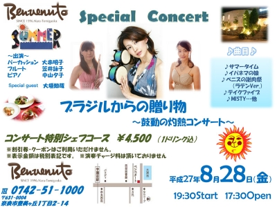 学園前のイタリアン、ベンベヌートさんで年に1度行われる、 パーカッショニスト大串明子さんを招いての大人気コンサートに、 ゲスト出演することになりました。 ブラジリアンパーカッションとフルート、ピアノとの共演! どんなコンサートになるか、今から楽しみです。 是非、お見逃しなく! Benvenuto Special Concert 『ブラジルからの贈り物〜鼓動の灼熱コンサート〜』 【日程】8月28日(金)コンサート開始時間:19:30〜 ご来場・お食事は17:30〜随時、何時でもO...