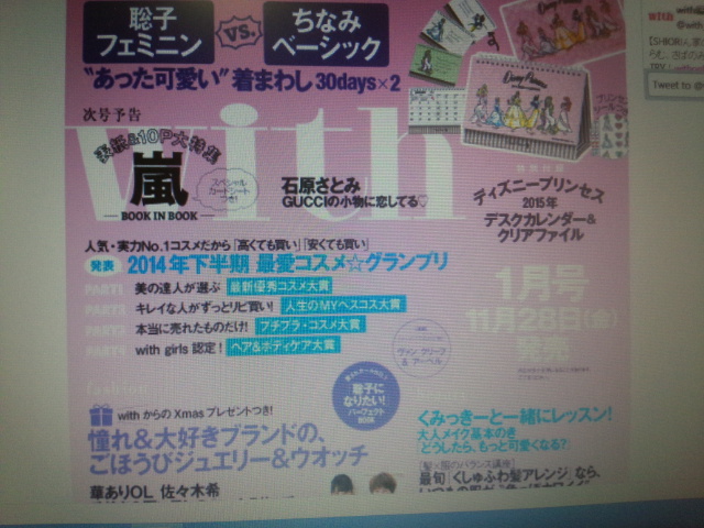 JUGEMテーマ:嵐さん。 次号、11/28発売のWithは、表紙に嵐さん! やったー! 10ページもあるのかー。 あ、 16時納品予定のものが 早く納品されたので、 いまからPC落として帰ります♪ わーい、今日は早めにおわったーーー♪