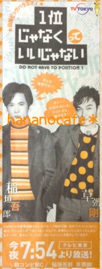 余韻に浸ってリピートする間もないほど連日連夜見る番組があって火を噴くSMAPファン。ありがたいけど、マジ大変w前代未聞つよぽんと吾郎さんというおっとりコンビ(ファンの間ではロハス、と呼ばれる組み合わせ^^)が初司会、しかもテレビ東京で!という番組「一位じゃなくっていいじゃない」新聞のテレビ欄の広告が笑うw「オレ仕切れないよ。ゴローさん、たのみます!」「オレも無理だわー」っていう番組の会見で二人が口にしたセリフが吹き出しでつけられてる。 「中居くんがやるような番組」byつよぽんなのに、このおっと...