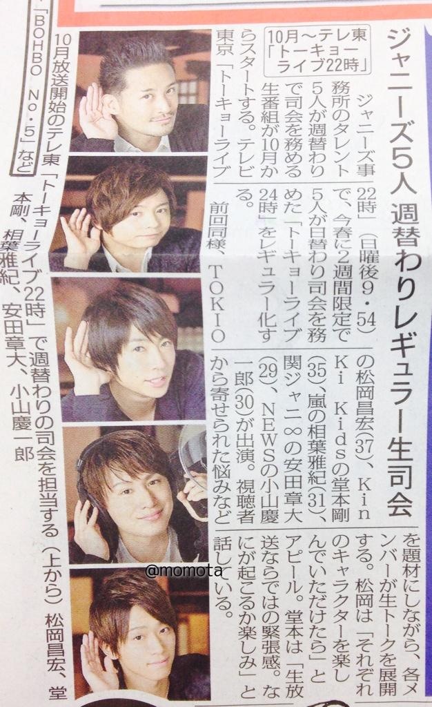 JUGEMテーマ:堂本剛 Twitterで流れてきたんですが、詳細がわからず、本当なのかちょっと待っていました。 今朝の新聞で発表になったようです。 そう、テレ東での生番組「トーキョーライブ22時」が毎週日曜日に復活すると。 5人なので、生といえども約1か月に1度くらいでしょうか。 よかったああ。 ジャニーズ×テレ東生番組、レギュラーで復活 テレビ東京系にて10月から、松岡昌宏(TOKIO)、堂本剛(KinKi Kids)、相葉雅紀(嵐)、安田章大(関ジャニ∞)、小山慶一郎(NEWS)が週替わ...