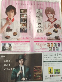 JUGEMテーマ:嵐 JUGEMテーマ:松本潤 おはよ〜ございます 今朝の朝日新聞に 潤広告がありましたね〜 朝から自転車でダッシュして買ってきました! 「失恋ショコラティエ」 松本潤×小動爽太 下には meijiのピーター潤まで・・ 失恋ショコラティエは・・ 左側には 松本潤 右側には 小動爽太 そしてね 真ん中には それぞれのキャラクターも。 爽太・紗絵子・薫子・エレナ。 あ〜ほんとに素敵・・ これは 保存版ですね。 全国のコンビニで売ってるみたいなので これはgetですよー!!! ...