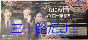 JUGEMテーマ:Jr.夫です。いまだ嫁はダウン中!熱が下がらないので応急診療所に行ってきましたが、インフルではなかったので、一先ず安心!早くしっかり治ってほしい!!!!!ということでなにわ侍 ハロー東京!!東京ではスポ紙全部にドーン!って感じで載ってたねほぼノーマークだったので何ゴトかとびっくりだったよジャニーズWEST デビュー記念公演なんてこともしっかり書かれてますまだまだ情報も少ないので、多くは言えないけど・・・とりあえず“関西⇒お笑い”的な要素はできるだけ排除してほしい!お笑いはそちらの専門の方々...