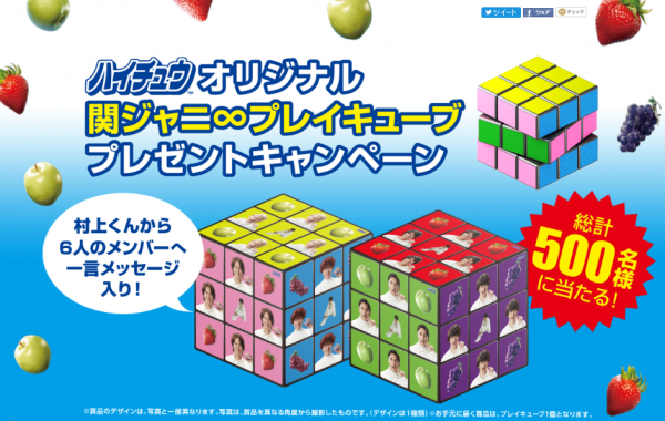 テーマ:関ジャニ∞ どうも! 今回はコチラの記事です。 8/12ハイチュウの日を記念し「関ジャニ∞プレイキューブが当たる!」キャンペーンスタート!抽選で500名様に関ジャニ∞メンバーとフルーツを揃えるプレイキューブをプレゼント!https://t.co/15pYaBryuu pic.twitter.com/IYu0hd2zLl — 森永製菓 (@morinaga_angel) 2016年8月3日 Copyright © MORINAGA & CO., LTD. ハイチュウオリ...