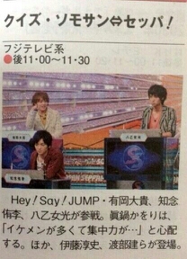 JUGEMテーマ:Hey! Say! JUMP 昨夜は「ダークシステム」をリアタイしようと思って早く寝たら、そのまま朝を迎えていた残念なともです伊野ちゃんがいい味出してたみたいなので早く観たいなぁ(笑)そろそろ「AinoArika」の番宣祭りが始まりそうですね1/31(金)PM11:00〜11:30【クイズ・ソモサン⇔セッパ!】に光くん大ちゃん知念くんが出演。トンチクイズに挑戦!!また知念くんの活躍が観れるね。楽しみ〜その他にも知念くんに仕事情報が。1/19夜のトニトニに知念くんをのぞくJUMP全員で観劇に行ったそうですが、知念くんはどうしたの?っ...