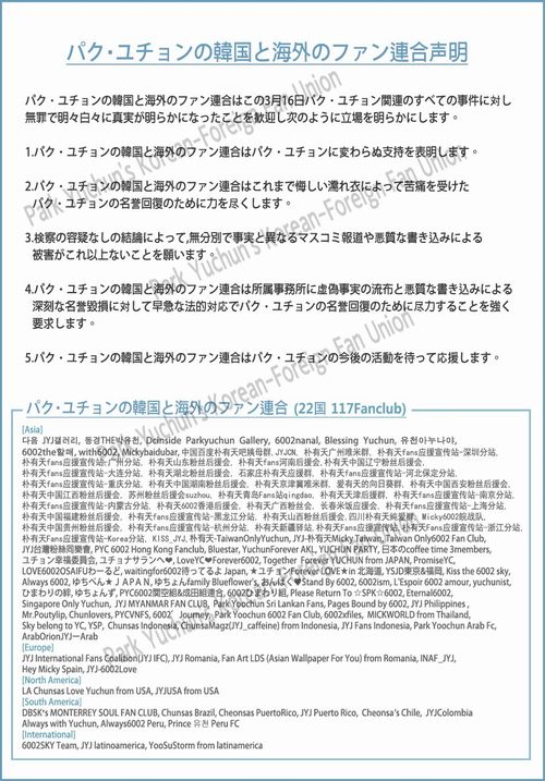 ファン連合からユチョン支援の声明が出ました。ここに名前のない多くの個人ファンも同じ気持ちでユチョンを応援しています。DCJYJゲルは名前がありませんね。関連した彼女は雲隠れしたまま水面下に潜んでいるようだし、ファンがCjesにゲルを閉じさせろという気持ちも良くわかります。事件が起きた後間髪入れずユチョンを非難して不支持を出したゲルが、その間ファンの代表みたいにメディアに取り上げられたことを考えると本当に腹が立ちます。今回のファン連合の声明をメディアが多く取り上げてくれたことは、DCJYJゲルと反対の立場を...
