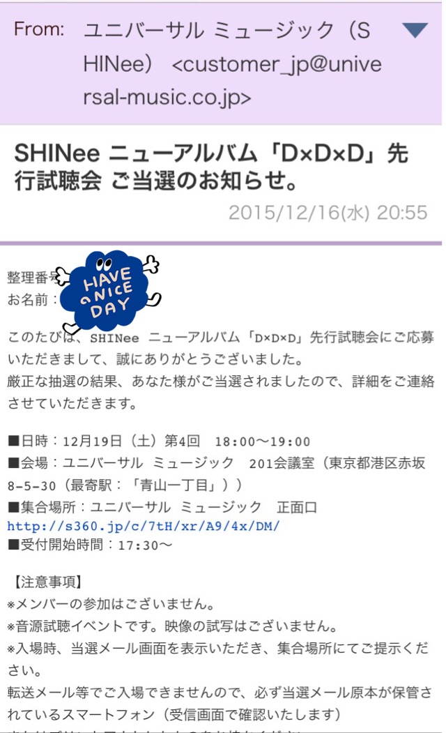 渡韓日記は一旦中断。 今日はSHINeeの来年1/1発売のニューアルバム『D×D×D』の、 先行試聴会に当選したので夜から参加してきました! こんなイベントでした。 SHINee ニューアルバム「D×D×D」発売記念!アルバム先行試聴会実施決定!「D×D×D」オフィシャルアンバサダーを大募集! 2016年1月1日(金)発売 SHINee ニューアルバム「D×D×D」発売に先駆けて、アルバム先行試聴会を全国(東京・名古屋・大阪・札幌・福岡)で実施することが決定!この試聴会に参加し、ニューア...