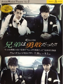 JUGEMテーマ:韓流♪7/30からアミューズミュージカルシアターで上演中の「兄弟は勇敢だった?!」初日はU-KISSのライブと重なっちゃって行けなかったけど、握手会つきのチケットが出たので、即効手に入れました。8/15までの兄弟は、キム・ドヒョン&チ・チャンウク次回観に行くのが期せずして1列目で、場所的に字幕を見れない(見にくい)可能性が高いので、ストーリーを把握するために今回は後方のS席にしました。ミュージカルは、1幕はコントっぽいところもあって笑えるシーンも多かったけど、2幕は一転して親子愛、家族愛を表現して...