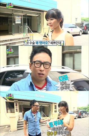 『無限挑戦』メン・スンジ、鼻整形手術告白「パク・ミョンスがさせた」 入力:2013.08.03 18:35 /修正:2013.08.03 19:18 メン・スンジ(一番上)が鼻手術した事実を告白して大きい笑いを与えている。/MBC『無限挑戦』放送キャプチャー [スポーツソウルドットコム?イダウォン記者]コメディアンのメン・スンジ(27)が鼻を整形手術した事実を告白した。 メン・スンジは3日午後放送されたMBC『無限挑戦』で「メガネを使えない」として「鼻手術するからだ」と告白した。 この日偽リポーターに扮したメン・スンジはユ・ジェソクと無...