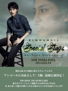 「キム・ナムギルスペシャルステージ」ジャパンFC会員先行予約 2014年4月10日(木)12時より受付開始!2014年3月横浜でのファンイベントを大盛況にて終えたキム・ナムギル ファンのアンコールにお応えして<大阪>追加公演決定!THE SHOW,THE SECRETに続き、新たなステージとして開催されるSPECIAL STAGEバンドを率いてのライブと、トークを中心に昼、夜と違った魅力を感じられる至福のひとときをお届けいたします!<開催スケジュール>2014年5月24日(土) NHK大阪ホール昼公演(LIVE&TALK) 13:00開場 14:00開演 夜公演(LIVE&...