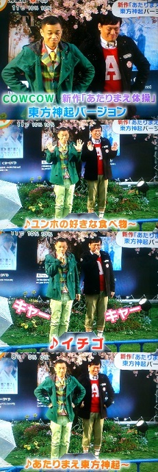 今朝のめざましTVで流れましたね。 東方神起ニューアルバム発売記念イベント。 ツアーで黒沢さん見つけられるかな?(笑) COWCOWの新作「あたりまえ体操」 東方神起バージョン写 ♪ユンホの好きな食べ物〜 ♪イチゴ ←ここでイベントを観覧してる方たちから「キャー」いただくという(笑) ♪あたりまえ東方神起〜 JUGEMテーマ:東方神起