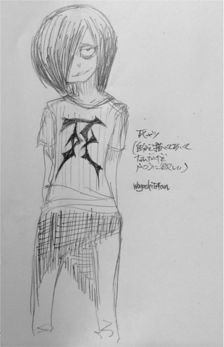 こういう落描きが送られてきたのでいつも通り清書させて無理矢理トレースしてTシャツにプリントしてみた。