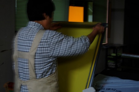 JUGEMテーマ:Tシャツ こんにちは!星ニットです。 本日のテーマは『シルクスクリーンプリントの工程』を 紹介します。 まずは製版です。 黄色い液体をスクリーンに塗ります。 この黄色い液体、光に当たると硬化するのです。 ですからフラッシュ禁物。写真もぶれてます。 この液体を均一に塗る技術はシロウトでは出来ません。 光に当たると固まってしまうので、暗い部屋で作業しています。 上の写真は、黄色い液体を塗って、乾燥機で十分乾燥させた版に版下と呼ばれる フィルムを乗せて...