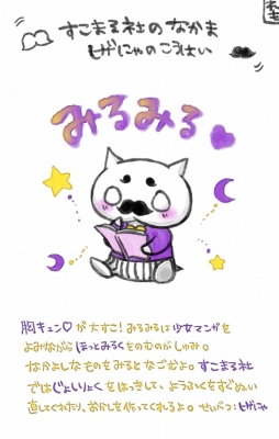 JUGEMテーマ:オリジナルキャラクター すこまる社のなかま、 「みるみる」をご紹介☆ミミミ 気になるせいべつは、ヒゲにゃ。 ヒゲにゃたちは、ヒゲにゃたちなのだ――。