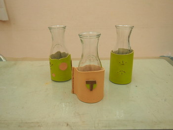 革で作った、ボトルのカバー。好きな色の革を選んで、チクチク縫って・・・。花瓶にしても、鉛筆立てにしてもいいね。革を縫うのにも慣れてきて随分と上手になりました。こちらもよろしくね*zakka mon*らくがきえんぴつ