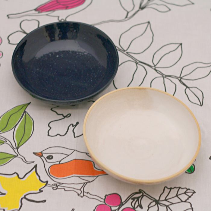 JUGEMテーマ:器 昨日引き取ってきた、白萩と瑠璃の器。 白萩のほうはフチをのこしてみた。釉薬のムラがうつくしい。 瑠璃のほうは土の色が白じゃないので紺色ぽい仕上がり。これは使い勝手が良さそう。前から器をプレゼントしようと思っていた料理上手のお友達のところに嫁に。おいしいものをのせてもらえますように。