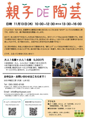 JUGEMテーマ:陶芸 ※詳しくは画像をクリックして下さい。 親子陶芸体験教室(11月)のご案内です。11月13日(木)に開催いたしますので、 近隣の方はもちろんご興味のある方はぜひご参加ください。 ranking←参加中です。よかったらクリックしてください。