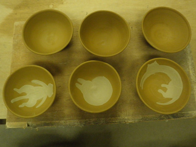 JUGEMテーマ:陶芸 雲に乗るねこシリーズで小鉢を成形しました。 10個できあがり。 このほかにも、長い猫シリーズ用にタタラで楕円皿4個、三角皿8個を成形。 マグカップとまめねこaの素焼きがあがっていたので、明日からいよいよ絵付け作業開始です。 老眼にむち打つぜ!