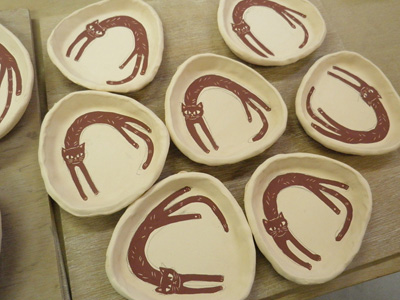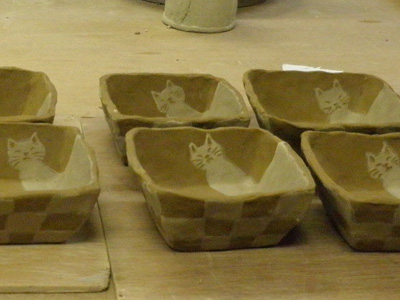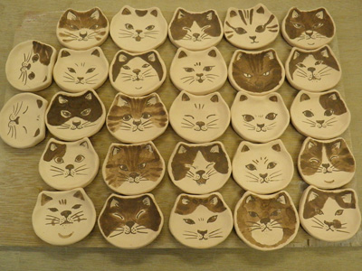 JUGEMテーマ:陶芸 箸置きを成形して面取りして色化粧してねこの絵を引っ掻きで描いた。 白土20個、赤土20個。