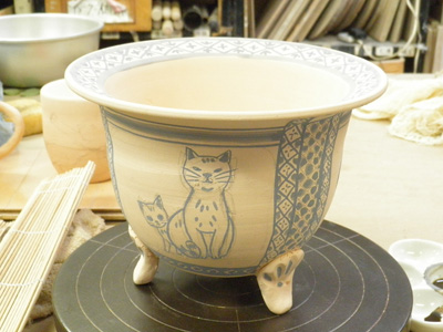 JUGEMテーマ:陶芸 大きめ飯椀(花ねこシリーズ)を作り始めました。 カフェオレボウルも作ってます。 こちらは両手で包んだときの感触がよりあったかいように手びねりで制作中。 もう11月も半ばに・・・・ 今年中に本焼きまでもっていけるよう、今日もこれから行ってきます。 予定してた細かいものは間に合わないかもです。