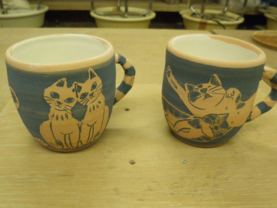 JUGEMテーマ:陶芸 絵付け作業を本格的に開始。 来年1月5日からのにゃんこ展に出します。 今回のシリーズは取っ手がしましま。 猫のしっぽに見える?