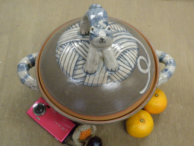 土鍋が焼き上がってきました。 鍋の季節にギリギリセーフ。 大きさの比較にみかんと携帯を置いてみました。 この比較基準にする物品にいつも悩む。 携帯でいいですかねえ? 横、ねこの取っ手は持ちやすいです。 中はこんな。2人用に作ったけどたっぷり入りそう。 にゃー! 目が合います。