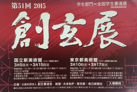 「月光に種をさらせり明日は晴」という自詠の俳句を書いて入選しました。創玄展の陳列はカッコよくて、何枚も何枚も書いて応募した甲斐があるなぁと嬉しく思っています。東京都美術館の創玄展の会場は、第3展示室のロビー階〜2階でして、約7,000点の入選作が展示されています。私の作品は、2階の31室に出ています。2階の入口入ってすぐの部屋です。場所が分かりづらいようでしたら、お気軽に係の方に聞いてみてくださいね^^ 創玄展 東京都美術館 3月10日(火)〜3月17日(火)月曜休館 9:30〜17:30 (入場は17:00まで) ...
