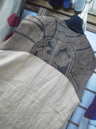 JUGEMテーマ:ファッションデザイン 手描きの幟旗を背中に配置してロングベストの制作中です。 無地の部分は綿麻の透け観のある生地。 柿渋染めにしています。 この幟旗は結構な値段で購入したのですが、以前、ある雑誌の作り方で作って大失敗してしまいました。 間違って作ったわけではないのですが、どうにも着にくい。 で、あまりにもがっかりしすぎて、見るのもつらく、やっとショックから立ち直り(大げさな・・・) 今日、ジョキジョキと切り取り、ここに使ってみました。 やっぱり、自...