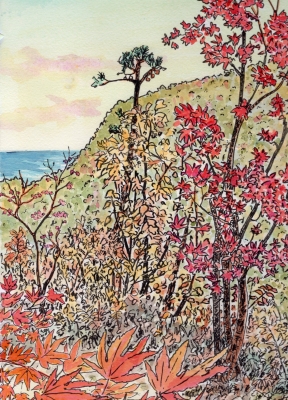 秋の陽は、傾き始めるとあっという間に沈んでしまいます。 紅葉が終わると雪の季節です。 夕ごはんも冬の したくも急がねばなりません。 アルシュ全紙 一部