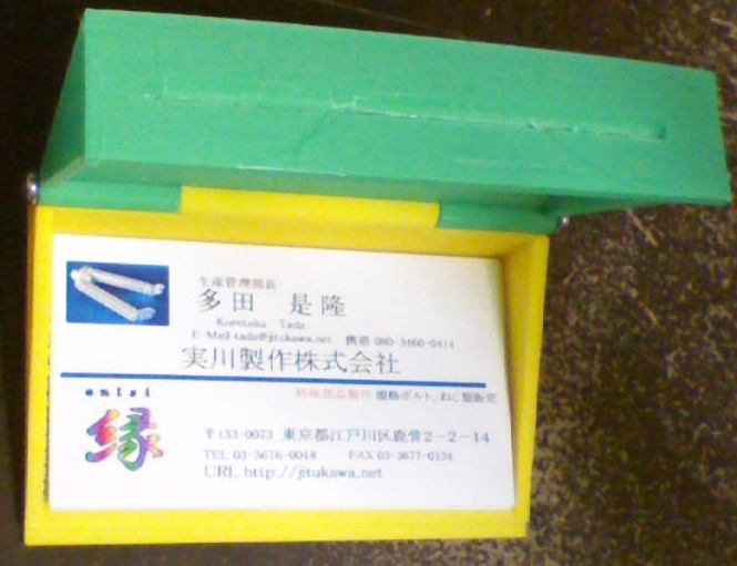 JUGEMテーマ:3Dプリンタ 名刺入れを3Dプリンターでプリントして見た。 最初は一体で印刷して蝶番で開け閉めしようとプリントしたが、隙間が無さ過ぎて、くっついてしまい失敗した。 剥がそうとしたら蝶番部分を壊してしまった。 仕方がないので、別々に印刷してネジで固定した、ピンの方が良かったかな とりあえず使えるから良いか、同時プリントは別なもので試してみよう