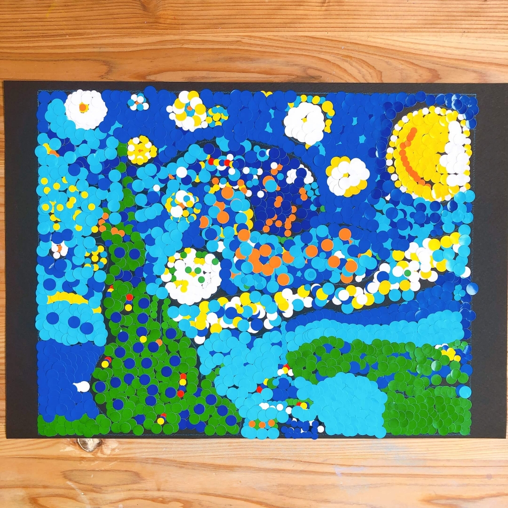 遠くで見るのと近くで見るのでは、どうして同じものでも違って見えるんだろう。 そんな不思議を感じるプログラム。 丸ラベルシールを使った点描で、名画を模写しました。 モチーフは、ゴッホの「星月夜」とモネの「積み藁(日没)」です。 (年長) (小3) (小1) (年長) モチーフ「星月夜」 JUGEMテーマ:美術教室
