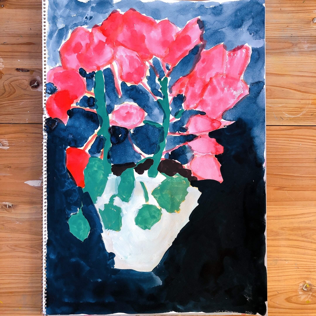 どれも見たことあるもの、知っているもの。 でも、本当にわかっているかな? トマトの色は赤、りんごの色も赤、どう違うの? バナナの黄色は? 形も色も、どこがどう変わっているか、違いを見つけること。観察、観察。 コンポジションで学んだ三原色と白と黒だけで描きます。 「ポインセチア」(小1) 「ポインセチア」(小2) 「ポインセチア」(小1) 「ポインセチア」(小3) 「ポインセチア」(...