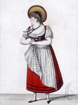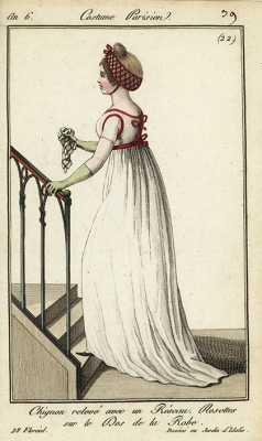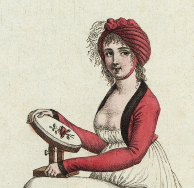 JUGEMテーマ:アンティーク版画 1800年のファッション画です 椅子に座って、刺繍枠を使うメルヴェイユーズ(素晴らしい女性) 帽子には pleureuse「泣いてる」という羽がついています 短い赤いスペンサー・ジャケット、...