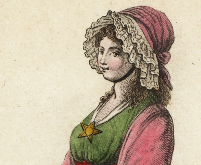 JUGEMテーマ:アンティーク版画 「ファションと女性の雑誌」 Journal des Modes et des Dames, 1797年パリ刊行 から bonnet a la folle (狂った女のボンネット)とあります ピンク色のバンダナが印象的です また、胸には星形の金のブローチが ...