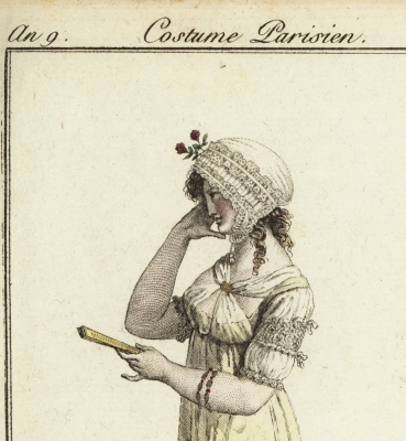 JUGEMテーマ:アンティーク版画 「ファションと女性の雑誌」 Journal des Modes et des Dames, 1797年パリ刊行 から Fichu (バンダナ)を巻いている女性 布を額で締めているこのスタイルは a la marmotte(マーモット風)といいます ...