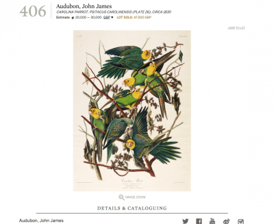 JUGEMテーマ:アンティーク版画 オーデュボンの『アメリカの鳥』1830年 カロライナインコ(Conuropsis carolinensis)1点 昨日、ロンドンのサザビーズのオークションで47,500ポンド(7,000,000円)で販売されたそうです!! カロライナインコ(C...