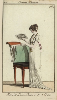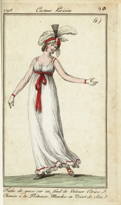 JUGEMテーマ:アンティーク版画 パリの女性のファッション 髪を結ぶために3本の大きなゴールドチェーンを巻いています シースルーのショールは細かいリネンで作られています ショールの端には、スカーレット(朱色)の幅広リボンで飾られています  ...