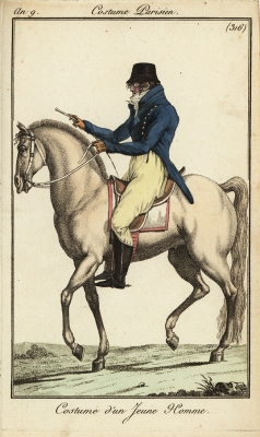 JUGEMテーマ:アンティーク版画 1800年のフランスの男性ファッション画 ハイカラー(襟が高い)ジャケットと 首元には、顎の上にまでかかるクラバット(スカーフ)を巻いています 女性は、フィッシュと呼ばれる小型のショールをつけていた時代です &nbs...