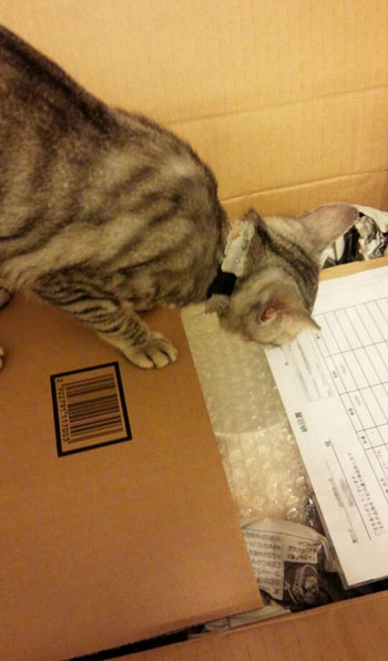 JUGEMテーマ:13.CATS.WORKS こんばんは! お客様からほっこり嬉しいメッセージとお写真が届きましたのでご紹介です(^^♪ 今回は「ネコ型フードテーブルミニサイズ」、一つ穴シングルタイプの「ネコ顔フードテーブル」、「猫ハウス」の3つをお使いの「そらちゃん」のご紹介! 到着後に早速品定めのそらちゃん! 好奇心旺盛ですね(^o^) 梱包をとくまで段ボールの中で遊んでいたそうです。 そらちゃんはごはん置きの食器で遊ぶことを覚えて、ごはんをば...