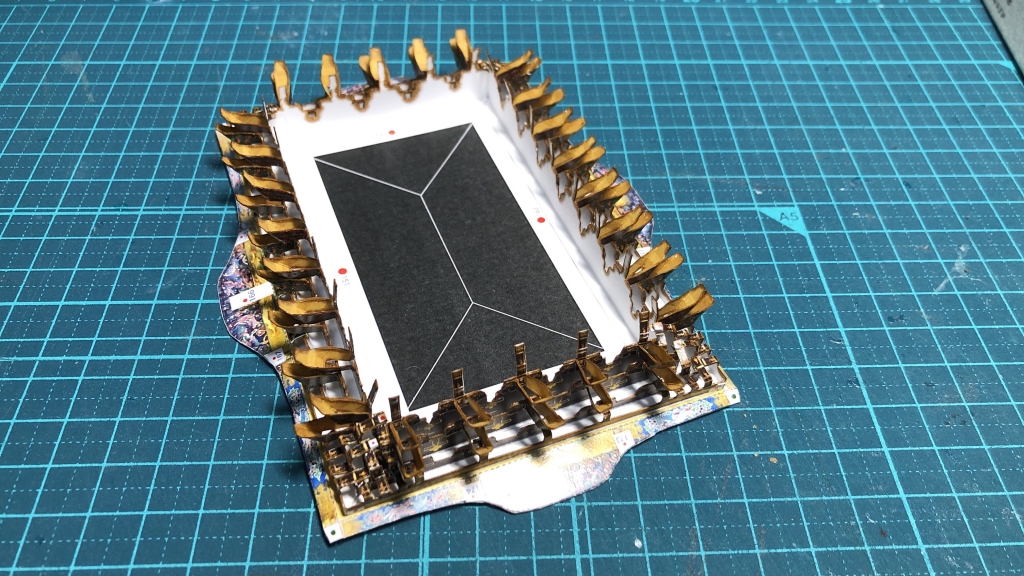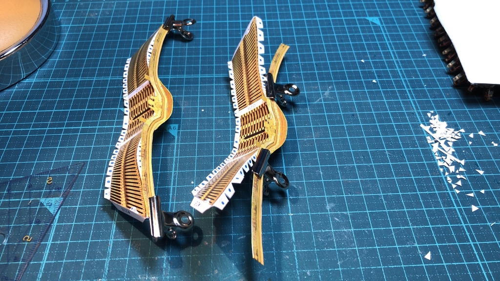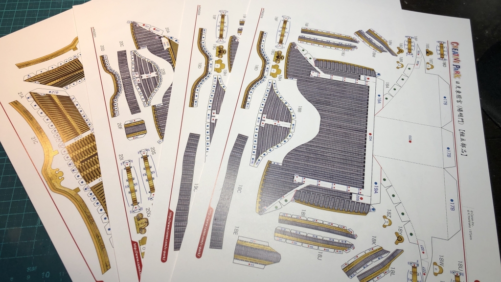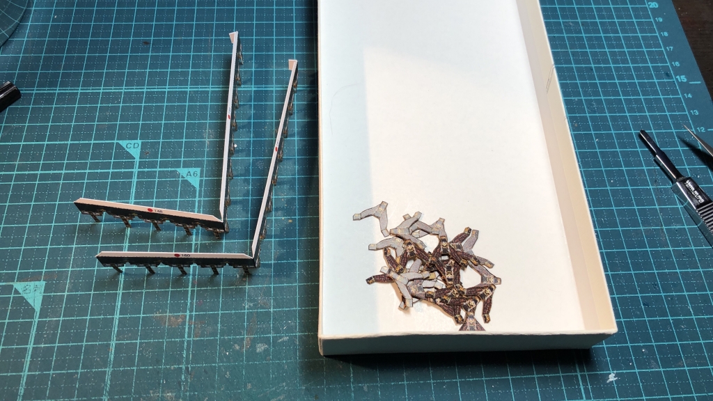 JUGEMテーマ:ペーパークラフト 苦戦している二階部分の天井ですが、物の怪、二十六兄弟とベロベロ短冊の切り出しも完了して、いよいよ組み付け開始です。 最後の段は、短冊も何も無いので、これが最終段階のようなものです。 まずは、ベロベロ短冊の段を接着して、 組み付けていきます。 後は、物の怪二十六兄弟をくっつけていけば、終わりなのです。 ...
