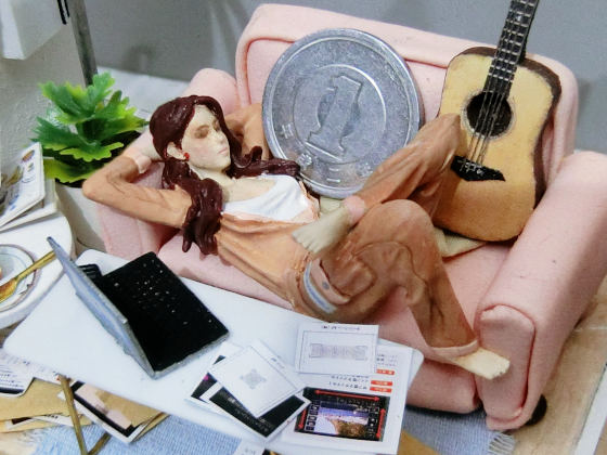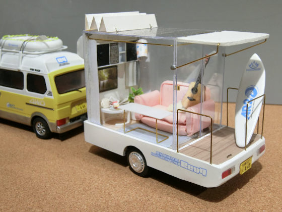 いろいろ紆余曲折があったもの、新しい1/24スケールの作品が完成しました。 主人公はガールズ イン アクション シリーズの一つで、Rita というフィギュア、買い置きしてあったもののなかから選びました。1/24という小スケールなので、身長は7cmぐらい。 これが作品の全体像です。軽のワンボックスに軽規格のキャンピングトレーラーを牽引して、あちこち出かけるというイメージです。シーンとしては海でも山でもいいわけで、そういう意味では見る側の想像...