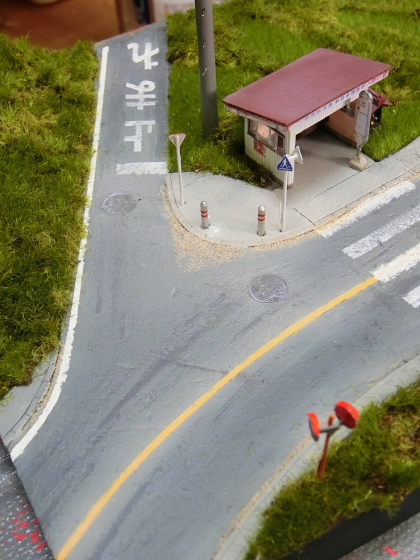 実在するバス停の風景を、1/72スケールのジオラマで再現するというお話の続きです。 制作もいよいよ終わりに近づいてきた。 バス停まわりの標識などを追加したら、俄然、リアルな感じになってきた。 一方で周囲の草原は、ただ置いただけの状況なので、今回はここに手を入れたいと思います。 バス停の裏側には、腰丈まで伸びたいろんな種類の雑草が生えているのですが、これを1/72スケールでリアルに再現するのはほとんど無理なので、ここは見ている人が、確...