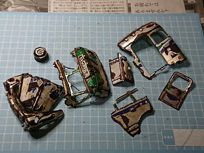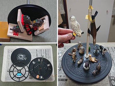 ボンネットバスは、情景師アラーキーさんが公開している「錆びめくれ」手法で錆び朽ちたように塗装ました。 「水中ニーソしまりすちゃん」の塗装です。 眼の塗装などは小さくて見えないので、実体顕微鏡を使って行いました(^^;) 肌の部分をマスキングし、水着の塗装をして「水中ニーソしまりすちゃん」の完成です。 電飾は黒のスチレンボードに画材屋で購入したシルバーの紙を貼り、フルカラーLEDを12個取り付けています。 これを全部配置して完成です。 飾るためのラウンドケースに...