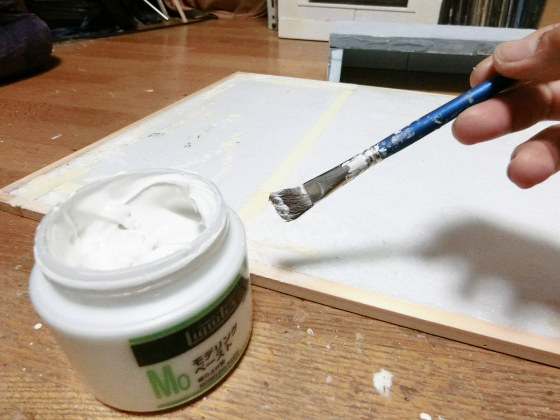 1/3スケールのお人形を置くための背景づくりは、ドア部分の作業が完了したので、今度は歩道とステップ部分の塗装に入ります。 8 そのままだと塗料が乗りにくいので、一面にジェッソをさっと塗り、粘土で起伏をつけてから、モデリングペーストをたたくように塗ってゆきます。 9 グレーからタンの色合いで微妙に変化させたアクリル絵の具を塗り重ねてゆきます。これだけでけっこう荒い感じのする歩道ができます。 10 水で薄めた...