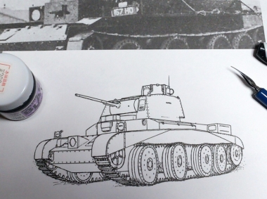 新製品予定の「1/144・巡航戦車Mk.III」ですが、写真のように箱画を描 きます。まず実物写真を参考にペンで線画を描いてそれをスキャンし、印刷 したものに水彩絵の具で彩色をして終了です。水彩のパレットにはタマゴの ケースを使います。全体的に昭和レトロなやり方ですね。 こうやって線画だけのものをスキャンしてデータ化しておけば、それに 直接PC内でデジタル彩色したり、線画だけまた印刷して別の彩色をしたり して遊ぶ事もできます。要するに「セルフ戦車塗り絵」ですね^^。 2枚目の写真がほぼ彩色を終えた...