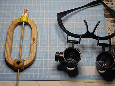 いよいよ一番難関の眼の塗装に入ります。 ネットで購入したx10 x15 x20の倍率で見えるという拡大眼鏡を使ってみます。 これ、両眼付いていますが、実際には片目づつでないと焦点距離が近すぎて使用できません。 なので片目が疲れたらもう一方で、とか右を塗るときは右で見て、などと使い分けました。 買っておいた塗装冶具、やっと陽の目を見る時が来ました(^^;) とてもアップには耐えられないので、遠目の小さい画像で失礼します(^_^;) エナメルの茶系で虹彩を塗りました。 いやぁ細かい!(=_=...