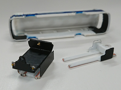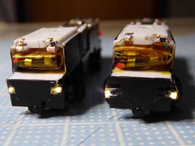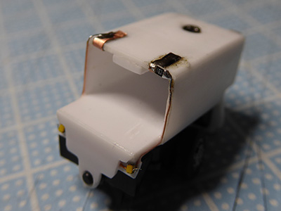 ボディの裏側や動力ユニットの側面や裏面に水性アクリル絵の具の黒を塗って遮光処理しました。 開口したヘッド&テールランプに0.5mm光ファイバーを入れて導光しました。 これで予定していた全ての改造が完了したので、テストのためにコースデビューです。 走行テスト(後ろから) 走行→減速→停止→発進→加速、テールランプ&ブレーキランプ動作OK 走行テスト(前から) 走行→減速→停止→発進→加速、ヘッドライト点灯OK 大きさが丁度良さ...