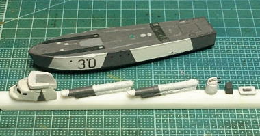 7月30日のワンダーフェスティバルまであと2週間を切りましたので、それの 準備に関するご報告をさせて頂きたいと思います。 上の写真は、5月度の新製品のボスパー70フィート艇(MTB30)の完成見本の 製作中のものです。 こうして部品ごとに塗装して、最後に全体を接着し、汚し塗装をします。 ものによっては現在の状態でやっておいて良いものもあると思われます ので、まずビットマルチ2等を使って仮接着してやろうと思います。 以前のMTB73と比べて迷彩塗装をしている上、甲板の塗装も...