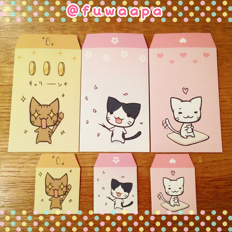 こんばんわ、フーライです。 ようやく少し暖かくなってきましたね! フーライは花粉と格闘中です(;´∀`) こちらでは告知が遅くなってしまいましたが、春の新作が出来ました!(Φ∀Φ) 猫イベントがこの先多くなる為、今回は「ぬこいろいろ。」で用意してみました〜。 1つ目が、ぽち袋です! もうお年玉の季節も終わりましたが、先月、フーライが必要に感じた事があってカッとなって作りました(;・∀・) (結局その時は間に合わずに折り紙にしましたw) 春に出す事もあって、中央のは春...