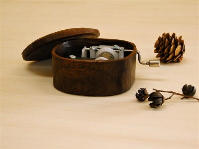 こんばんは。 手回しオルゴールを作りました。 ウォールナットの刳りものの箱にムーブメントを収めました。